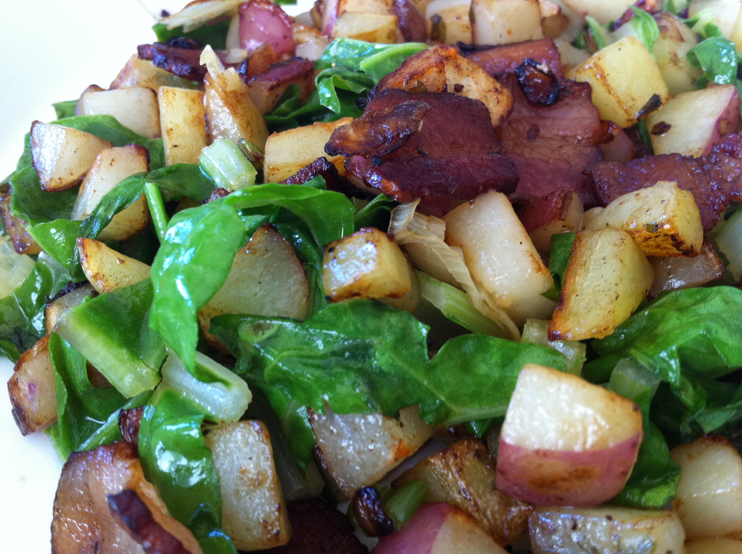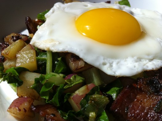 What I had on hand in the fridge – yummy bacon I’d gotten the day before from Irvings farm, some fingerling potatoes and super fragrant green onions from our CSA basket. My grandmother had also sent a big bunch of swiss chard from her garden in Vancouver by way of my parents who were visiting the week before. Perfect for a garden hash, especially topped with a gooey Sunworks Farm egg.
