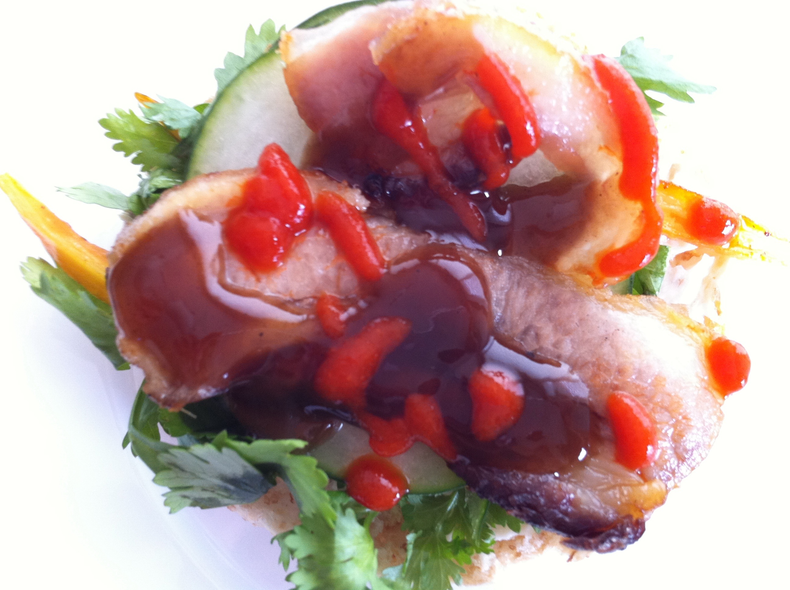 Simple to make – Toasted the bun, pan fried pork belly slices. Spread laughing cow on the bun and topped with quick pickled cucumber slices, thin carrot strips, and cilantro. When pork belly is golden, it’s added to the bun and on goes hoisin and sriracha (to your taste).