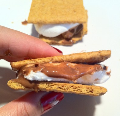 Once the marshmallows have swelled and are getting golden and crispy on the outside (gooey melty on the inside), place one on top of the chocolate covered cracker and add another cracker to make your S’mores sandwich.