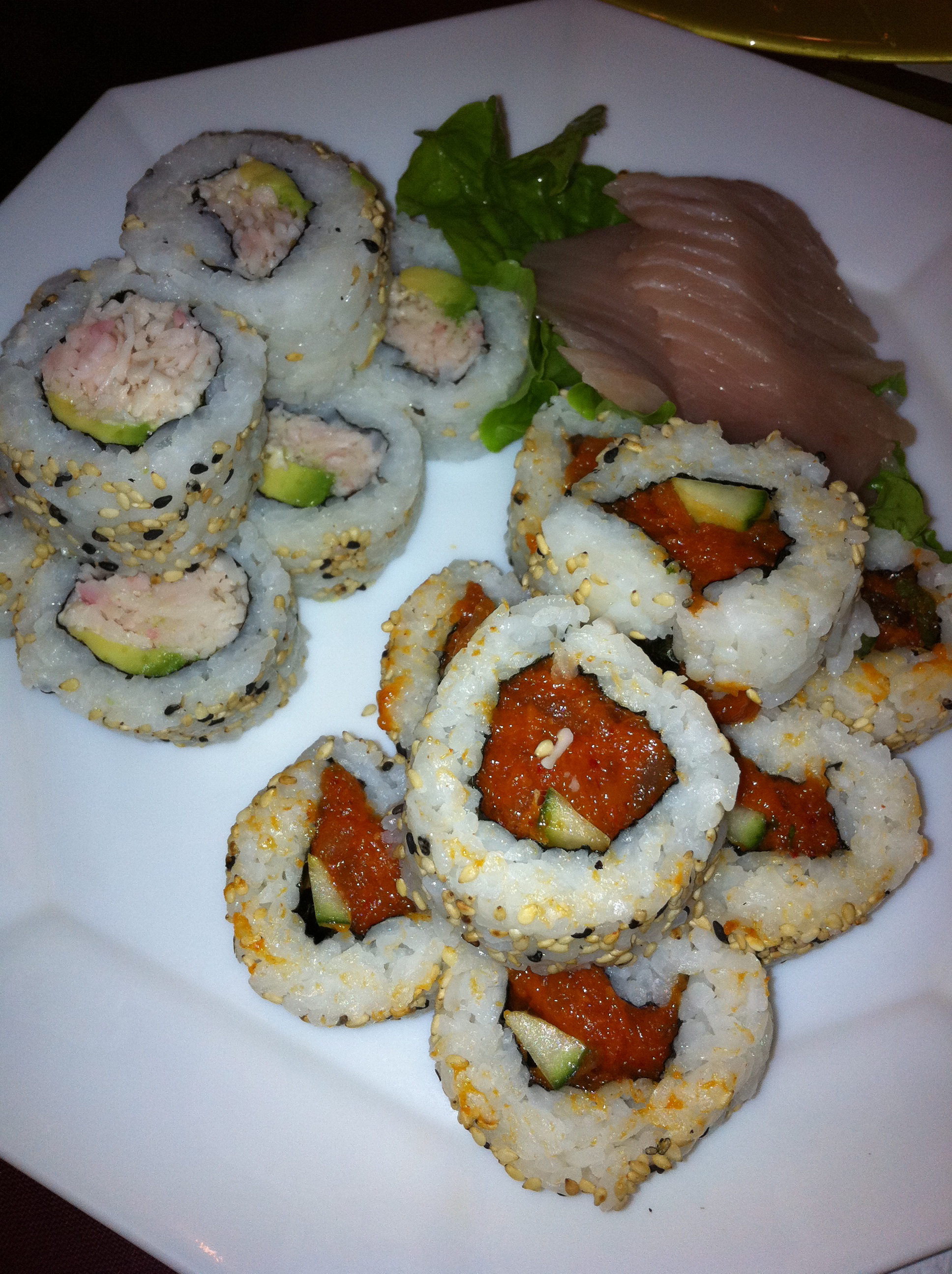 Next up,we received the Toro sashimi, California Roll, and Spicy Tuna Rolls. I thought it was strange that the sashimi came out with the sushi and on the same plate. Sashimi is usually served first before other items. Sashimi has such a delicate flavour that serving it as a first course prevents it from being overshadowed by the other flavours.