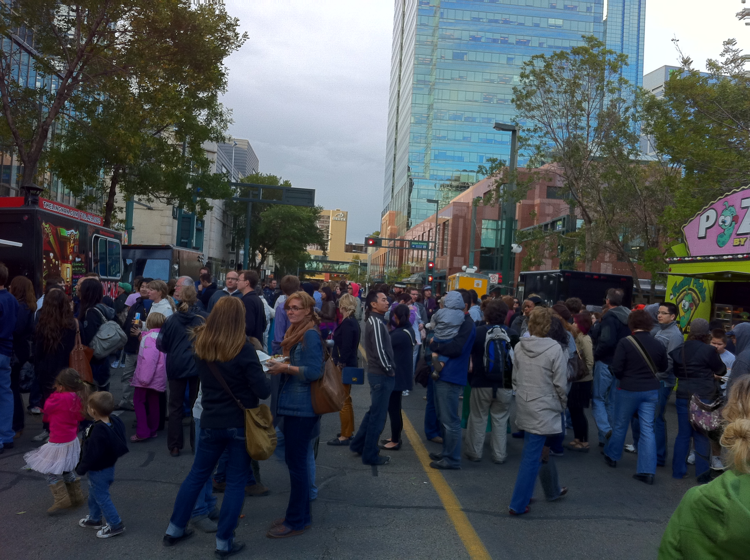 The second “What the Truck?!” event was held tonight at Abby Lane Park (Jasper & 102 St). Hosted by Mack and Sharon, two of Edmonton downtown’s biggest champions. Following a trip to SF’s Off the Grid, Mack and Sharon brought What the Truck?! to life in Edmonton. What better way (than food trucks) to 1.) get people excited, and 2.) bring people downtown at a time when most would be going the opposite direction, leaving downtown to get home – food always brings people together!