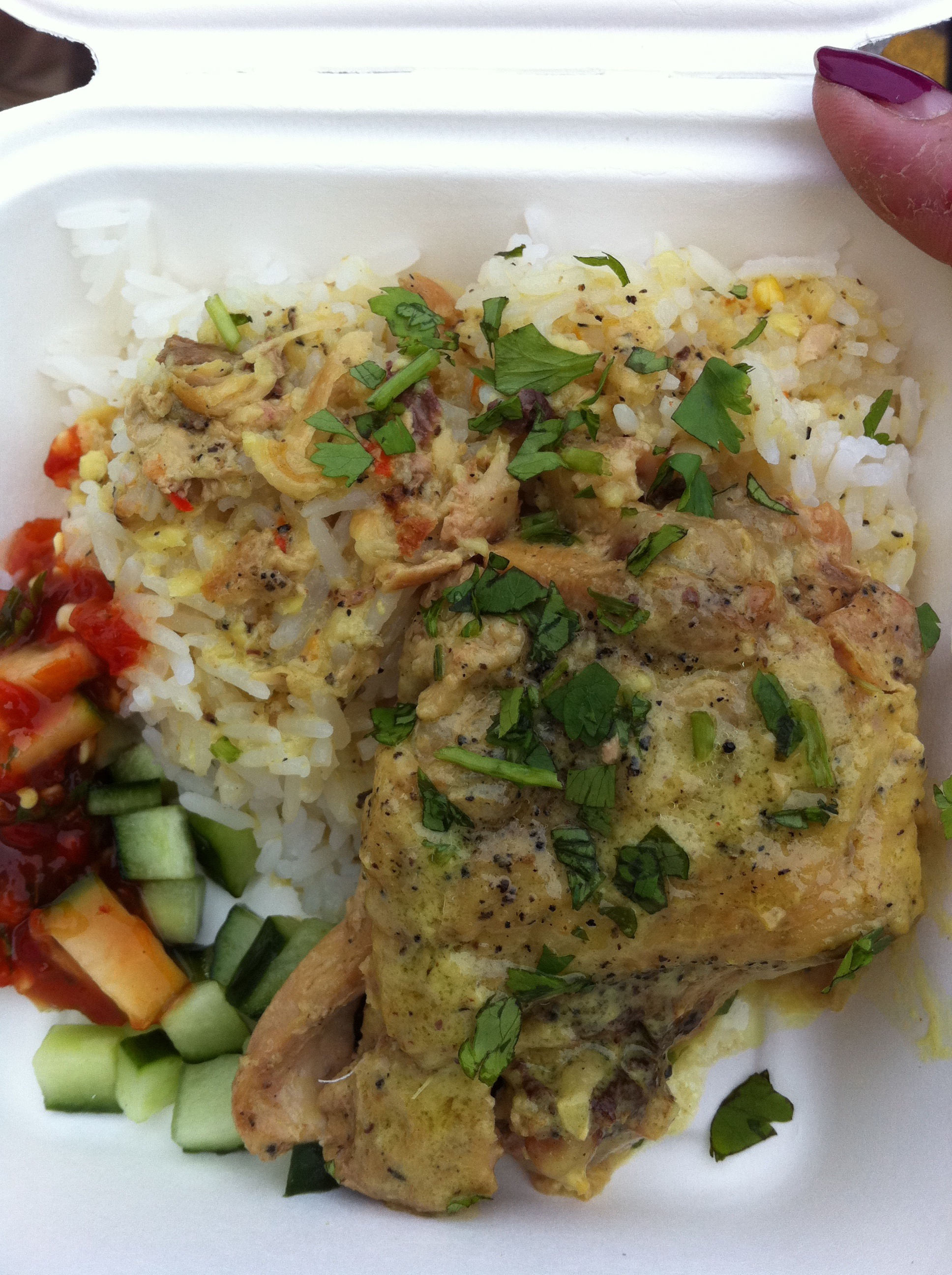 It was well seasoned with just a hint of heat and the chicken thigh was so tender, we managed to eat the full dish with two plastic spoons. The dollop of Filistix hot sauce that I added was great! Fresh with cucumbers and hot like sriracha. Went really well with the creaminess of the chicken.
